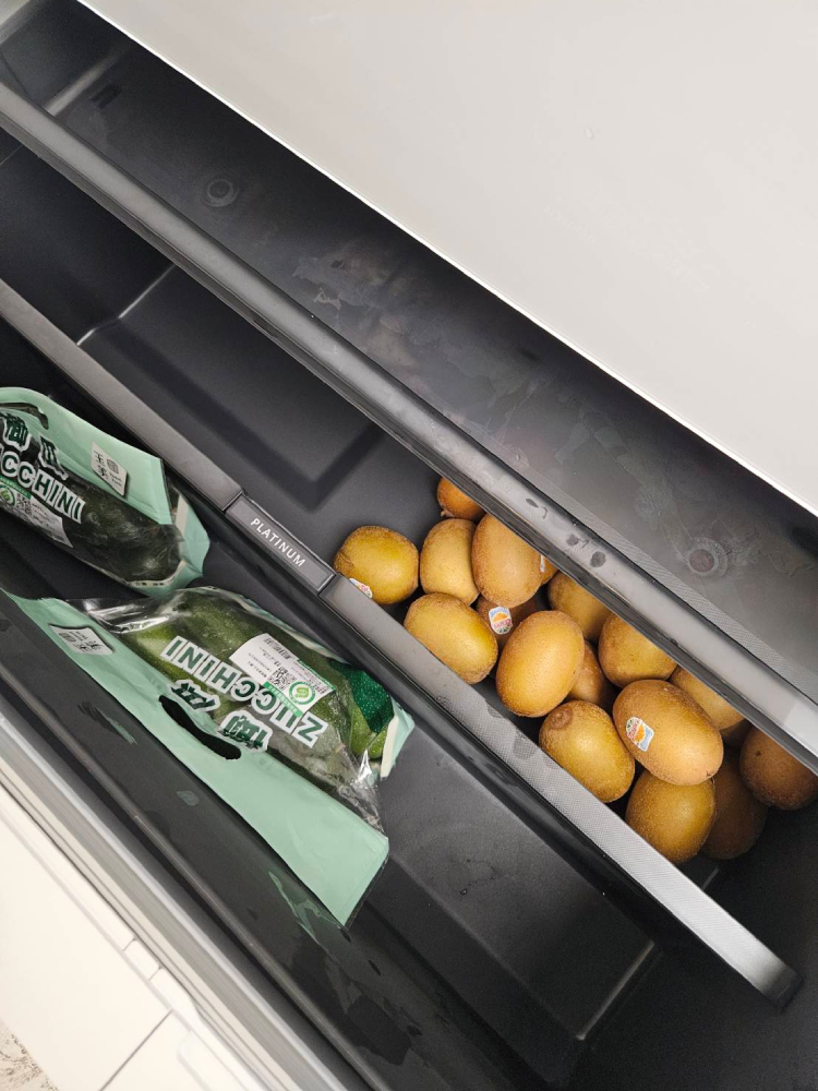 同一時間我放了一顆在舊家的舊冰箱裏面,同樣裸裝,放同樣的時間。看得出右手邊這顆他牌舊冰箱的儲放的奇異果已經皺皮了。有了這個蔬果保鮮功能。等於是幫所有的蔬果敷保濕面膜。可以幫主婦主夫們爭取更多的處理時間,也不用一天到晚跑市場。也不一定要為了保濕左一包塑膠袋,右一包塑膠袋。東西全部包裡面根本搞不清楚什麼。