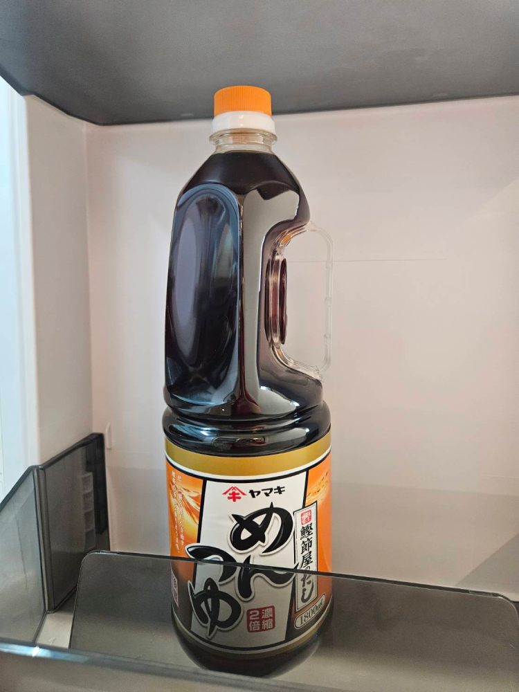 冰箱門側邊的收納高度可以放進超大罐的公升裝醬油。(這種鰹魚醬油開封後要冷藏。但是量販店就是這麼大罐!很多媽媽們的處理方式是回家分裝再冰。不然就是根本不能買便宜的量販店,要去買比較貴的小罐裝。)