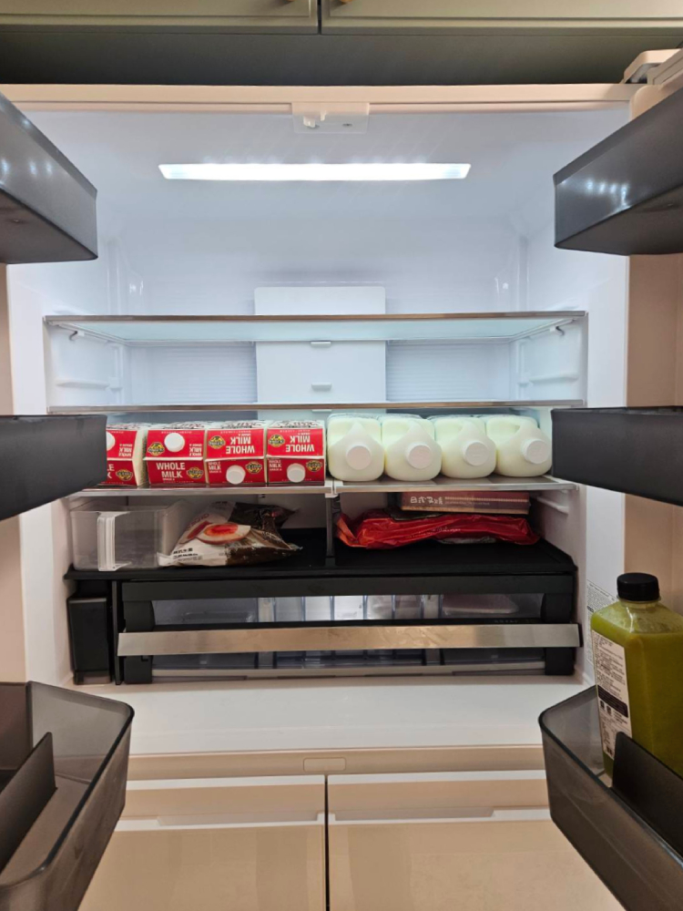 (請注意冰箱門的收納分隔多麼優秀。放完一大罐家庭號還可以塞下罐裝飲料或者優酪乳!)