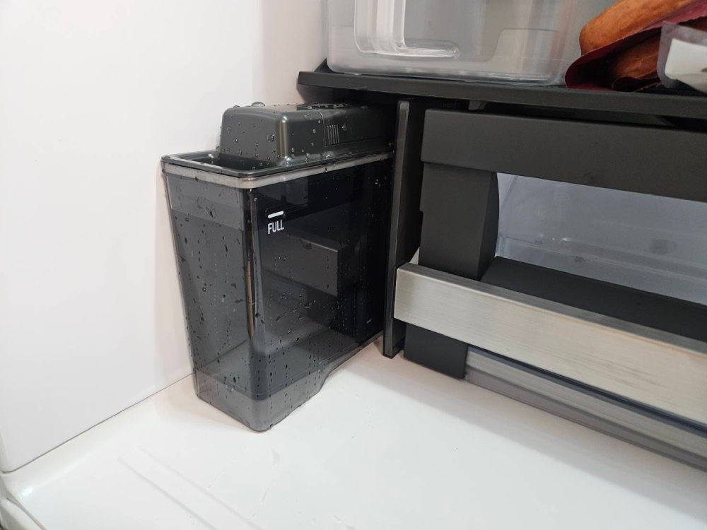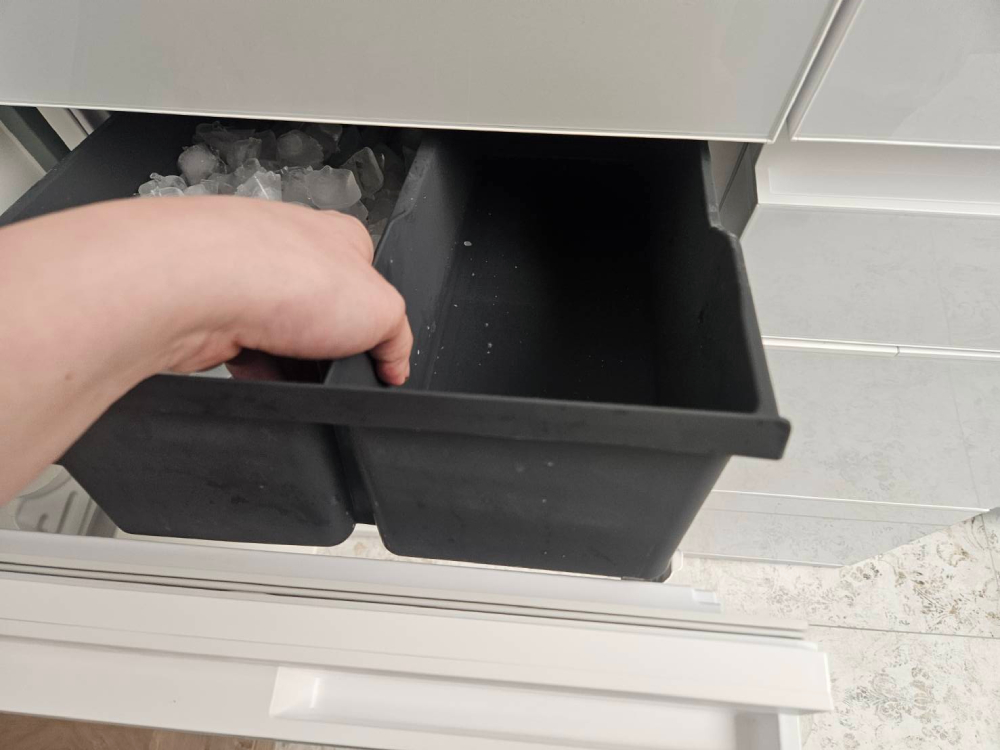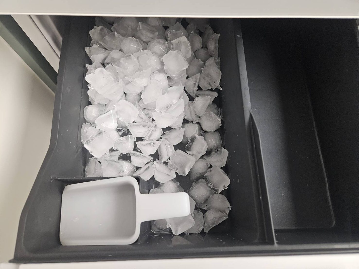 製冰室是裝水之後自動製冰。方便的地方是不用牽水線,也不用擔心之後水線的清潔的問題。而且他製冰室收納處自己的設計是整個盒子可以拿出來!要清洗,要完全倒出都很方便。