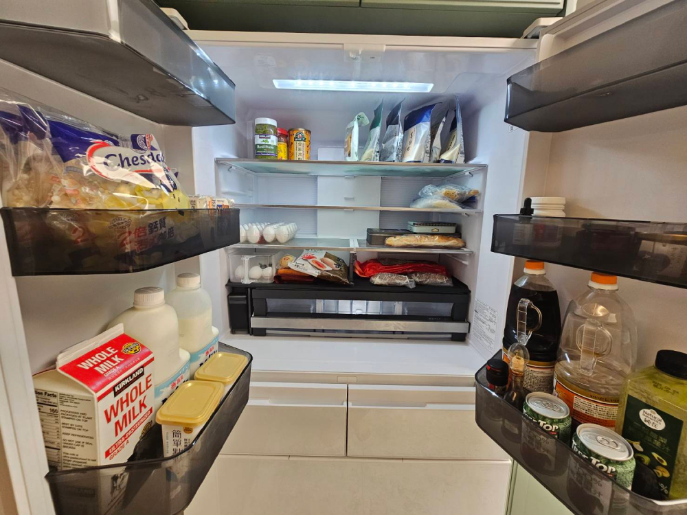 冷凍櫃更是大到不可思議。分隔拿取都非常方便。使用過後我跟我先生還討論:啊?我們冷凍式直立櫃是不是買太早了?日立這台好像就夠用了?